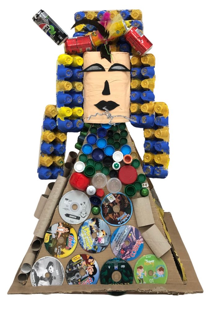 Nuestra mascota es «El Diamante Egipcio», está inspirada en Egipto, un taller final del proyecto de historia y la Edad Antigua de nuestra clase. El diamante emula a las pirámides y la cabeza a un faraón egipcio como Tuntakamón. Hemos utilizado diferentes materiales reciclados (hueveras, latas, cartones, periódicos, cápsulas de café, garrafas de agua, plumas, CDs, tapones…) y aprendido a reutilizarlos, reciclarlos, transformarlos y sensibilizarnos con el medio ambiente. Un trabajo cooperativo y grupal que bien ha merecido la pena.